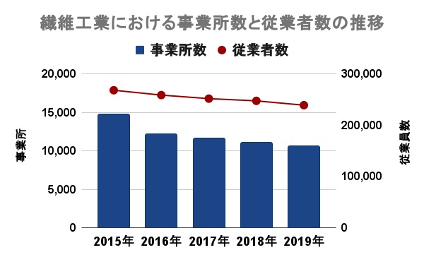 経済産業省が発表した「2020年確報 産業別統計表」によると、繊維工業を営んでいる企業の自称書数・従業員数は、2015年から2019年にかけて減少しています。
