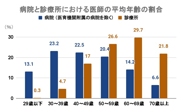 病院で働く医師の年齢は30~39歳が最も多いことを加味すると、クリニックに従事する医師の高齢化は深刻であるといえます。