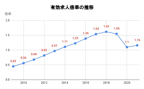 また、2018年にはアベノミクスの影響により景気が回復したことから、有効求人倍率は1.62倍を記録しました。