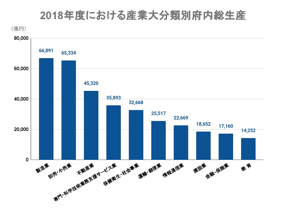 大阪府が発表した「なにわの経済データ」によると、2018年度における総生産額は、製造業が6兆6891億円、卸売・小売業は6兆5334億円でした。