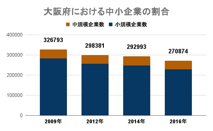 中小企業庁が発表した「都道府県別規模別企業数」によると、大阪府の中小企業数は2009年から2016年まで減少を続けています。