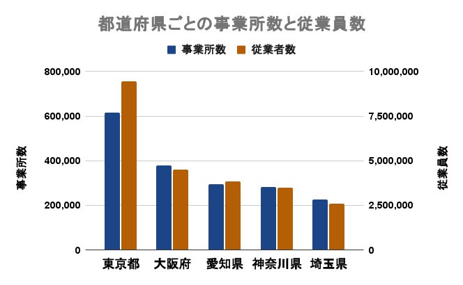 この事業所数と従業員数は、東京都に続いて全国で2番目に高い数値です。
